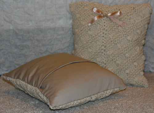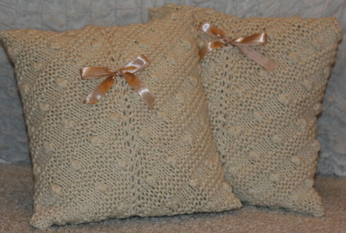 Például úgy, ha az ember elfárad, és egy kötött díszpárnán hajtja fejét álomra. Ezek a párnák ajándékba készültek, méretük kb. 35*35 cm. A masni cserélhető, így mindenképp a környezetébe illeszthető:).