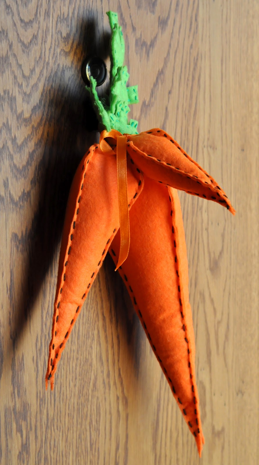 A szokványostól kicsit eltérően mi répás ajtódíszt készítettünk, de a nyúlnak biztos könnyebb lesz megtalálni minket.
