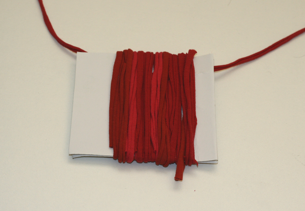 Tehát, ha van régi, megunt pólónk, amit szívesen újrahasznosítanánk, akkor daraboljuk fel kb. 1 cm-es csíkokra. Vágjunk le két kb. 7*10cm-es kartonlapot. A két kartonlap közé fektessünk be egy szálat, majd kezdjük el körbetekerni a szálakkal a kartonlapokat. Tipp: mindig “alul” kezdjük, így a legkevesebb a veszteség a pompon szálakból.