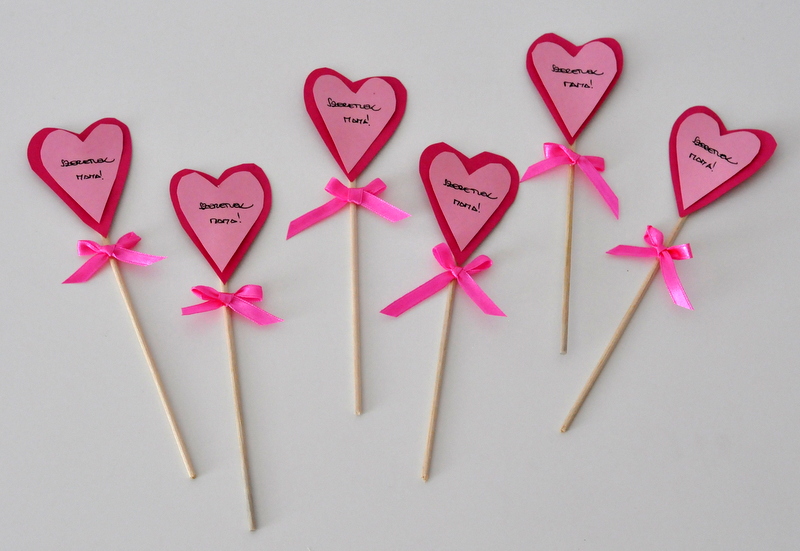 Állítsuk össze a pálcákat úgy, hogy minden hurkapálcát elfelezünk, a végére felragasztjuk a szíveket, a szívek alá pedig a masnikat.