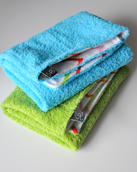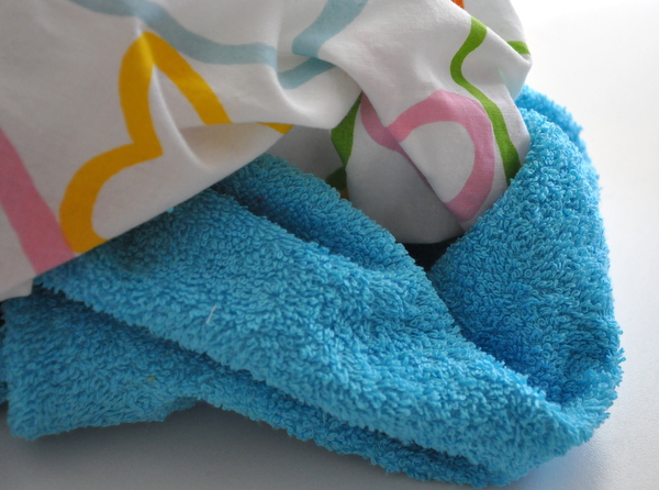 Amire szükségünk lesz: 2 db 40×60 cm-es frottír anyag, 2 db 40×60 cm-es mintás pihe-puha tiszta pamut anyag.