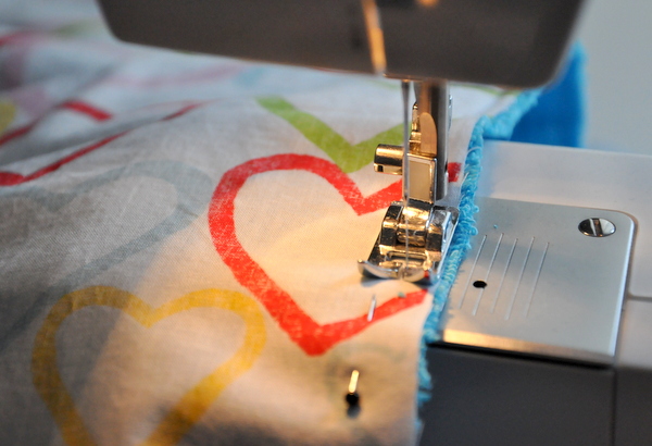 Varrógéppel öltsük végig 3 oldalán. A negyedik oldalon hagyjunk egy 10 cm-es lyukat – ezen keresztül kell majd kifordítanunk.
