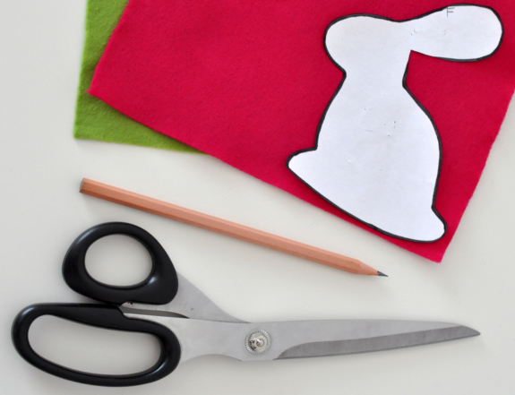 Vágd ki a szabásmintából a nyuszit és a fül belsejét, rajzold fel a filcekre. 1 nyuszihoz két oldalra és egy középső fülre van szükséged.