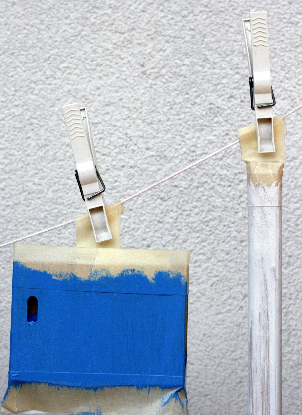 Nem akartam, hogy az egész egy színű legyen, ezért maszkoló szalagot használtam. A festést megkönnyítve “akasztót” is ragasztottam rá, így nem kell aggódni, hogy a friss festésbe beleragad ez-az.